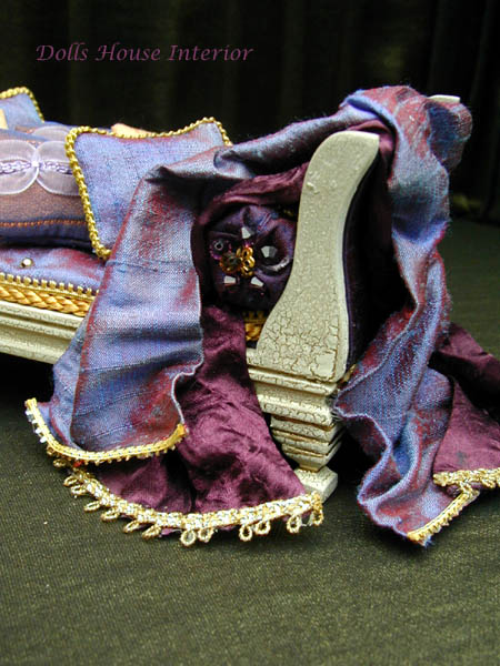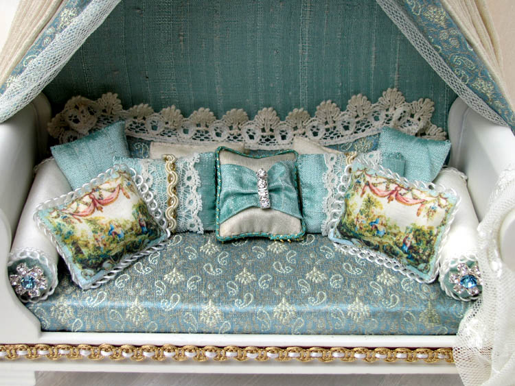 The bed coverlet is made from Aqua Silk Brocade