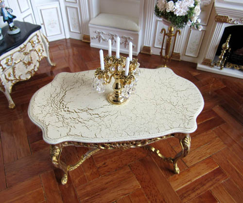 The table is Hand finished in gold with a cream & gold crackle glaze top
