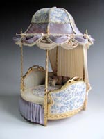 The elaborate canopy has cream silk and brocade swags edged with lace and tiny braid.